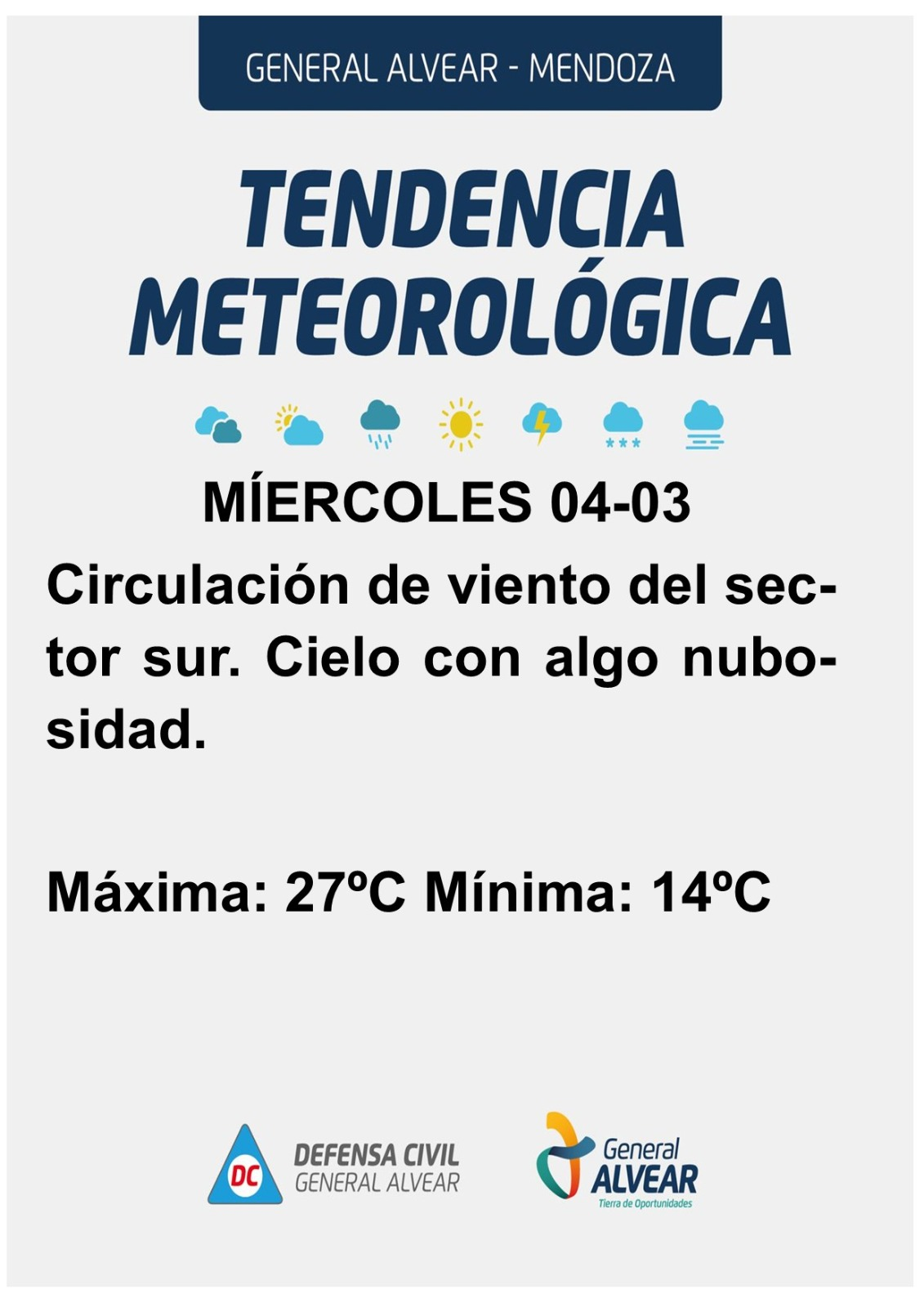 | Miércoles 04 | 15°C | 26°C | Sur-Sureste | Nubosidad variable |