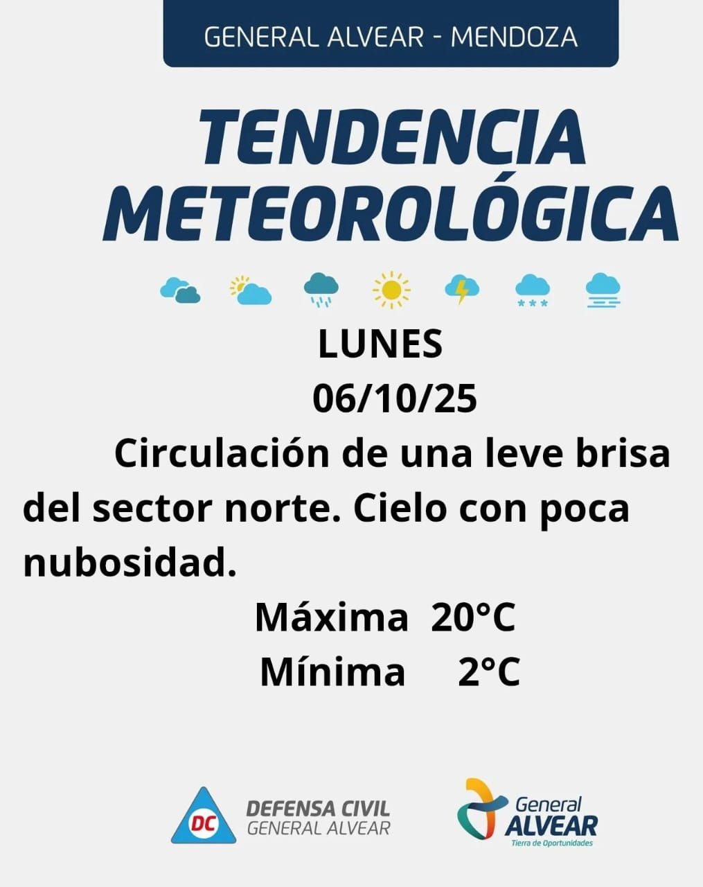 | Lunes | Brisa leve del Norte | 2°C (Zona urbana) | 20°C | Poca nubosidad. Marcada amplitud térmica. Atención con heladas parciales en el agro. |