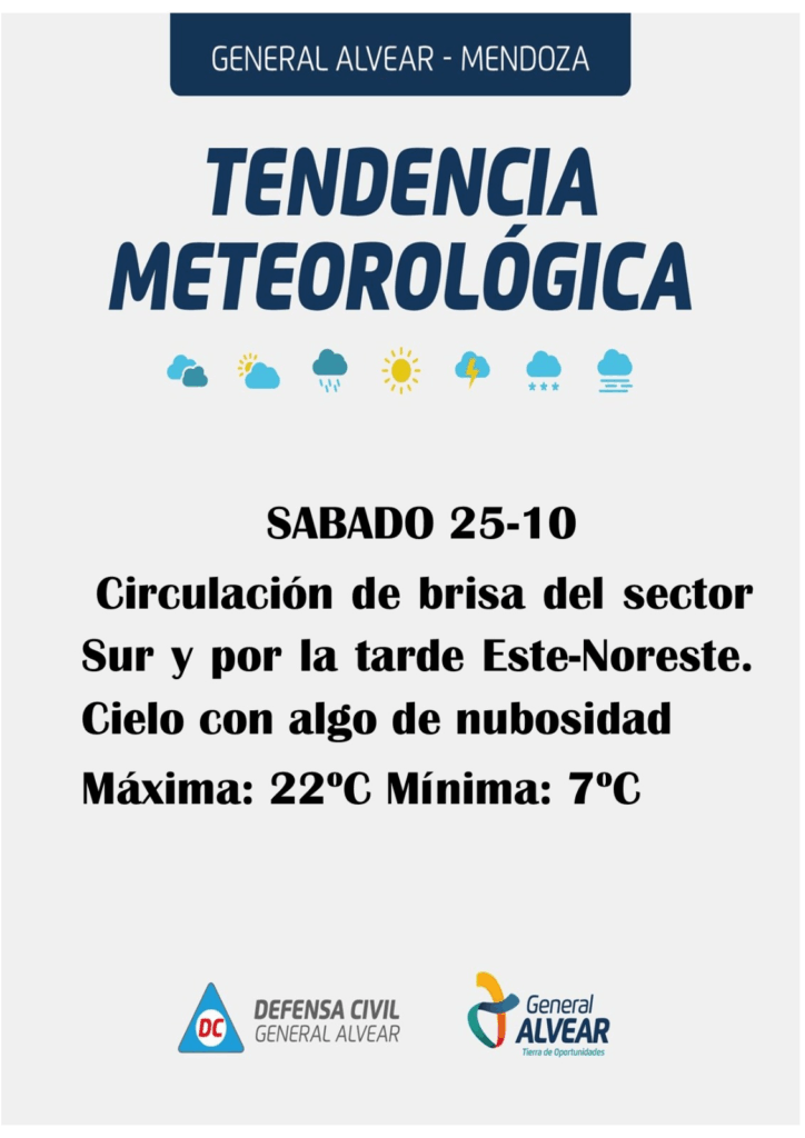 La tendencia meteorológica para este sábado 25 de octubre en General Alvear indica un día fresco por la mañana, con temperaturas agradables por la tarde y vientos cambiantes.