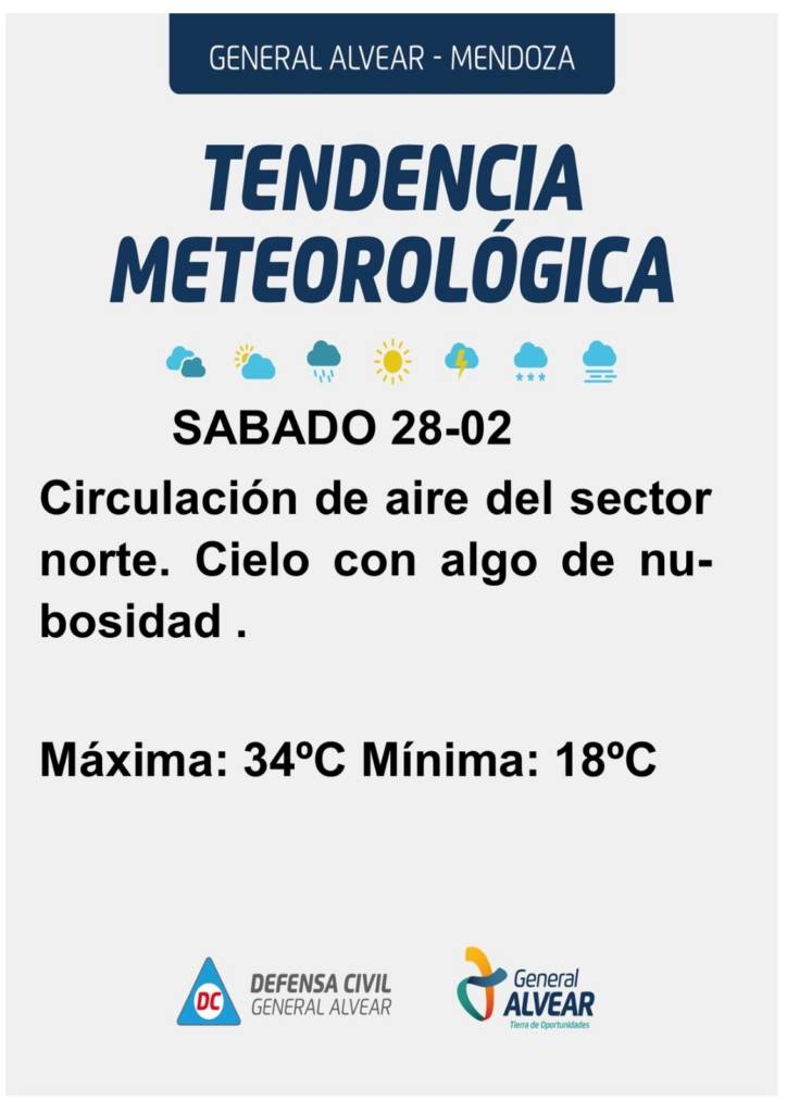 - Sábado 28 (Hoy): Continúa la circulación de aire del sector norte. El cielo presentará nubosidad variable en algunos momentos del día. La mínima se estableció en 18°C y la máxima escalará hasta los 34°C.