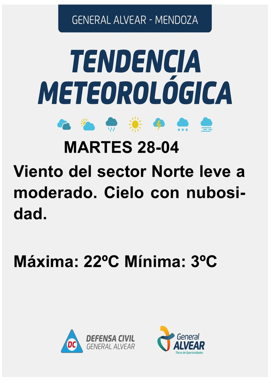 El inicio de esta última semana de abril llega con condiciones climáticas dominadas por el frío en General Alvear. La jornada de lunes se caracteriza por la circulación de vientos del sector norte y una marcada amplitud térmica. Las primeras horas del día se presentan sumamente frías, con mínimas que oscilan entre 0 grado y 1 grado bajo cero en diversos sectores del departamento, mientras que la temperatura máxima registrará un ascenso rápido hasta alcanzar los 20 grados hacia la tarde.