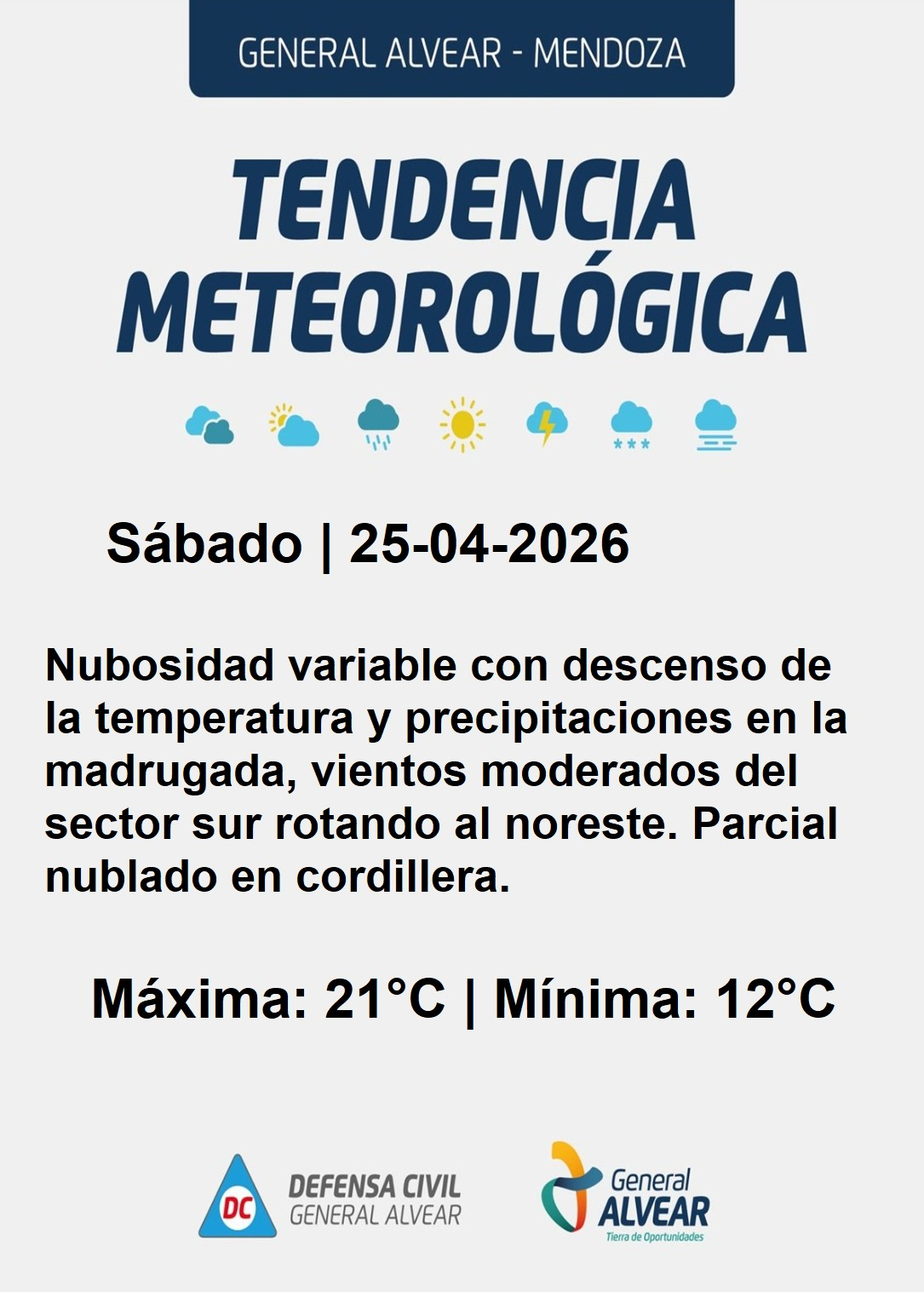 La Dirección de Defensa Civil de General Alvear ha emitido la tendencia meteorológica para este sábado 25 de abril de 2026, alertando a la población sobre los cambios significativos en las condiciones atmosféricas que caracterizarán la jornada.