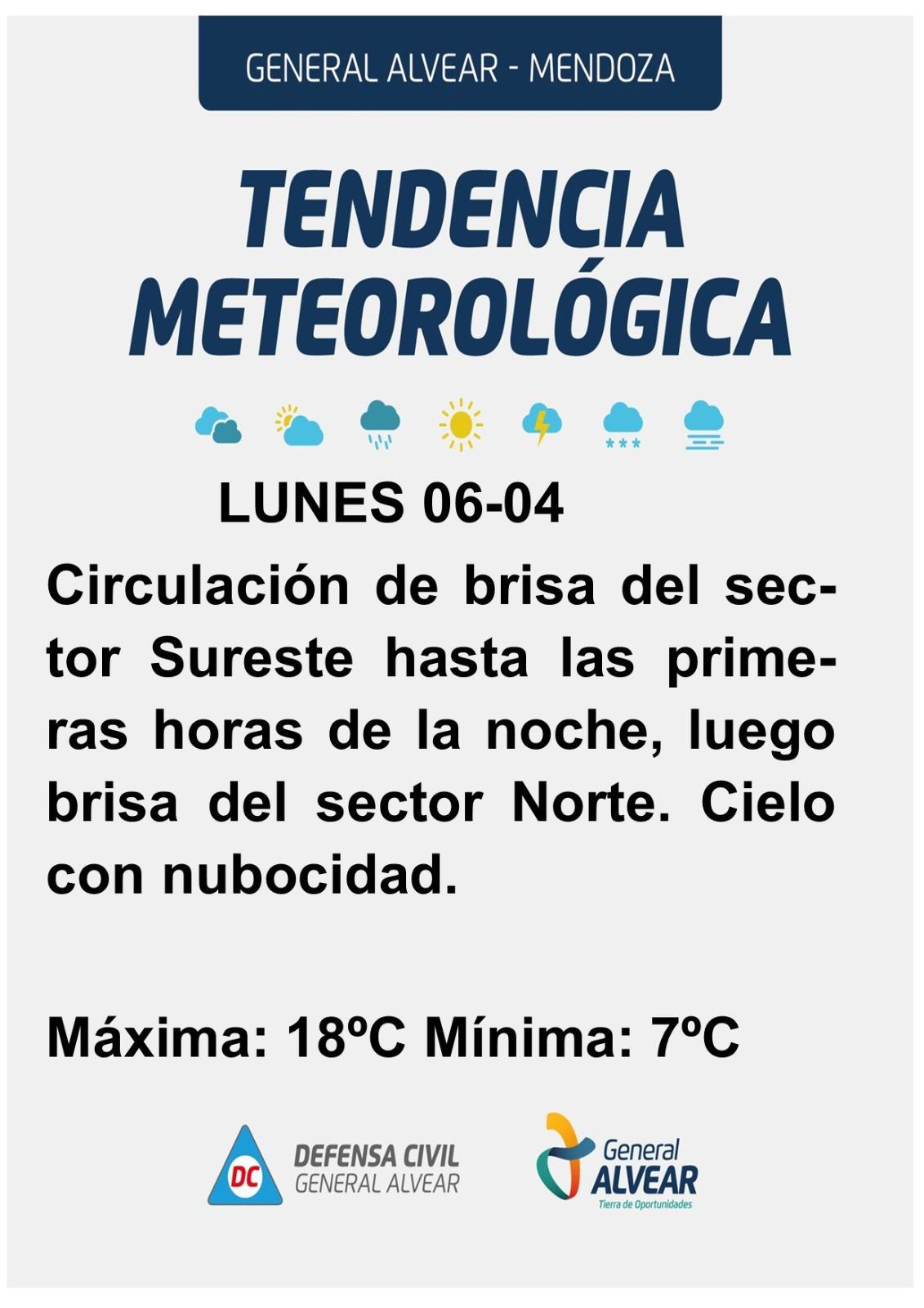 Los alvearenses arrancan la semana con un clima típicamente otoñal. Tras una mañana fresca que registró una mínima de 7°C, el lunes se presentará mayormente nublado y con temperaturas moderadas, aunque la tendencia indica una mejora paulatina en las condiciones para los próximos días.