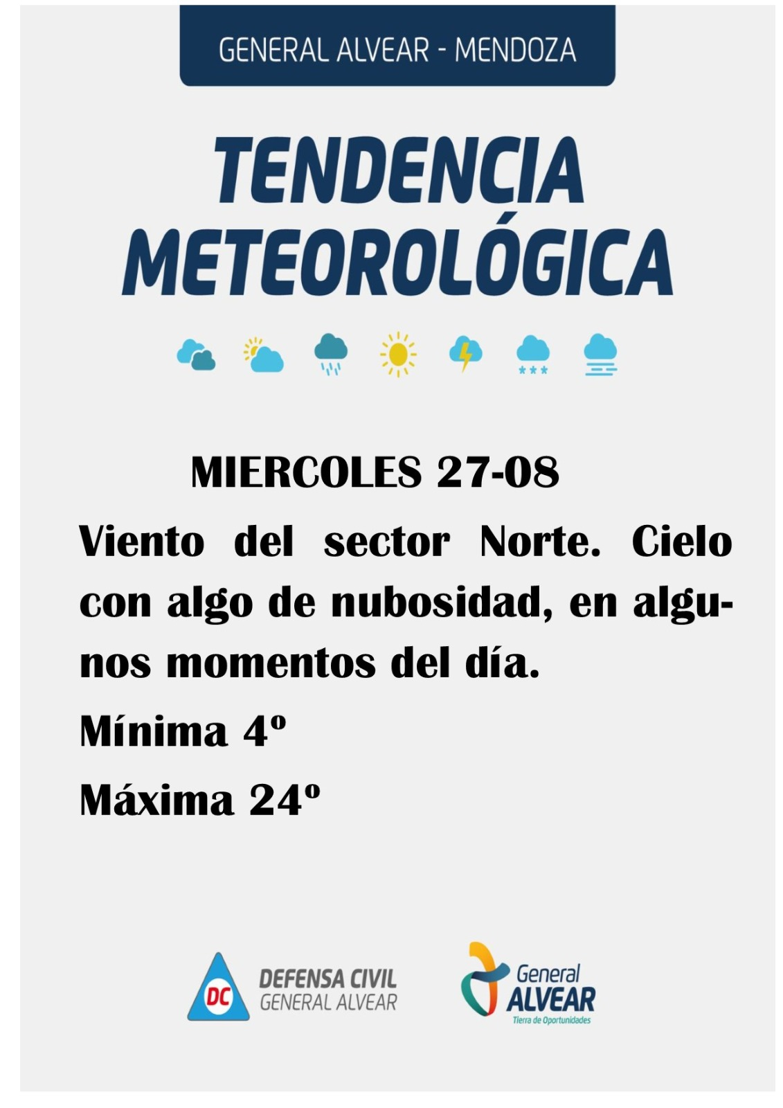 Para este miércoles 27 de agosto, el Pronóstico del tiempo para General Alvear anticipa viento del sector norte y un cielo con algo de nubosidad durante diferentes momentos del día.