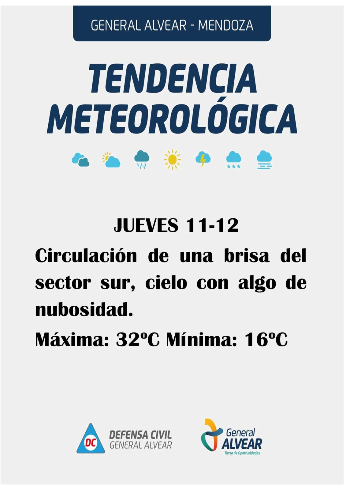 - Fenómenos: Existe la posibilidad de que se desarrollen algunas tormentas hacia el sur de General Alvear, específicamente en la zona de campo y la zona este del departamento.