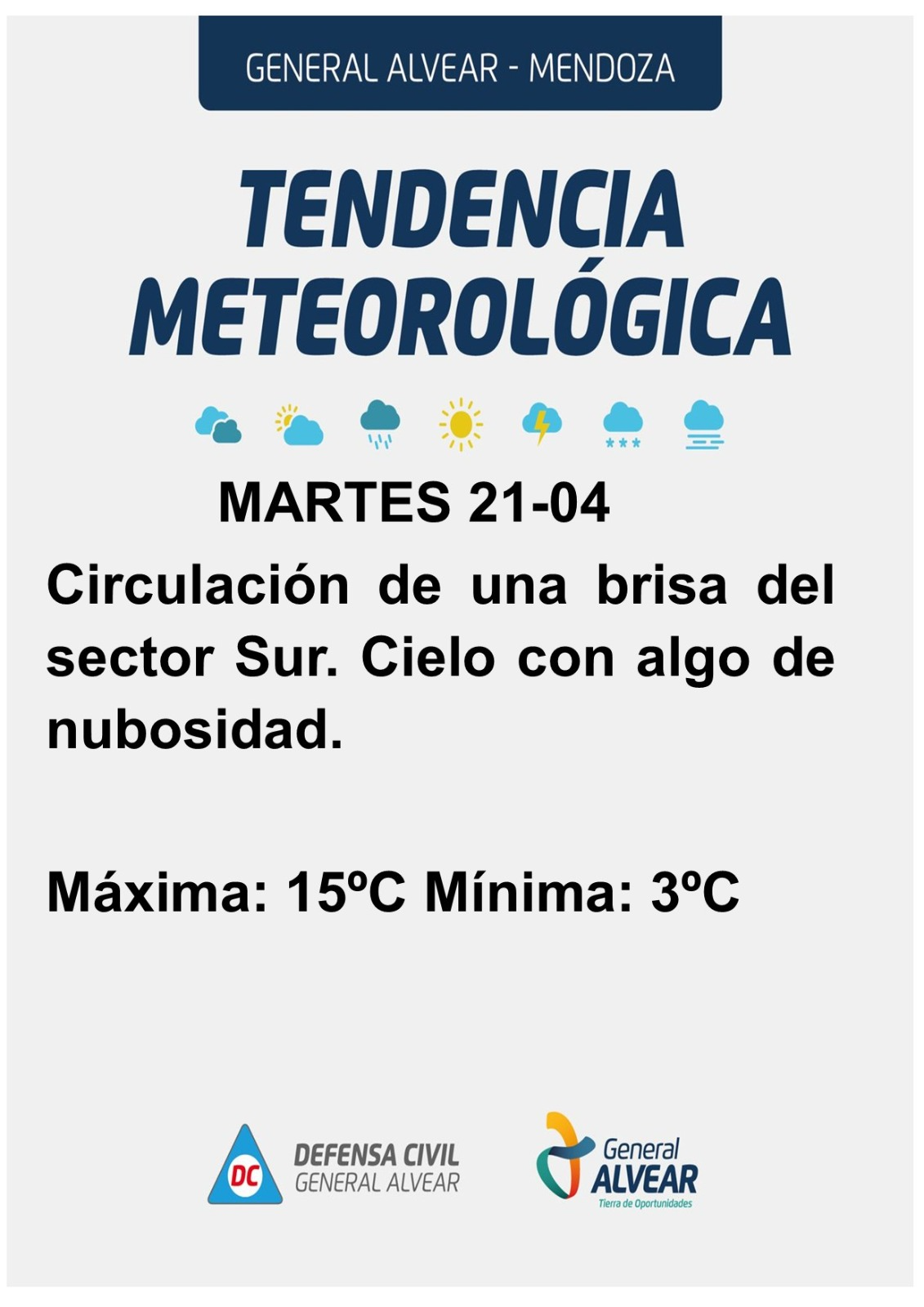 - Martes 21 de abril: El día comienza con circulación de aire del sur, aunque hacia la tarde se espera el ingreso de aire del sector este-noreste. El cielo presentará nubosidad parcial, disminuyendo hacia el final de la jornada. Se prevé un ambiente frío con una mínima de 4°C y una máxima de 15°C.