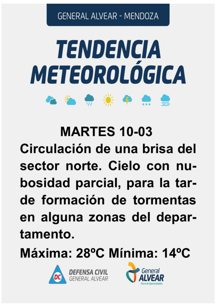 El Servicio Meteorológico local advierte que, hacia la tarde, se producirá un incremento en la nubosidad que derivará en la formación de tormentas. Si bien estos fenómenos suelen ser de carácter localizado en General Alvear, no se descartan precipitaciones de intensidad variable en algunas zonas del departamento. La combinación del calor acumulado durante el día y el flujo de humedad genera las condiciones ideales para el desarrollo de celdas convectivas que podrían afectar tanto a la zona urbana como a las áreas rurales.