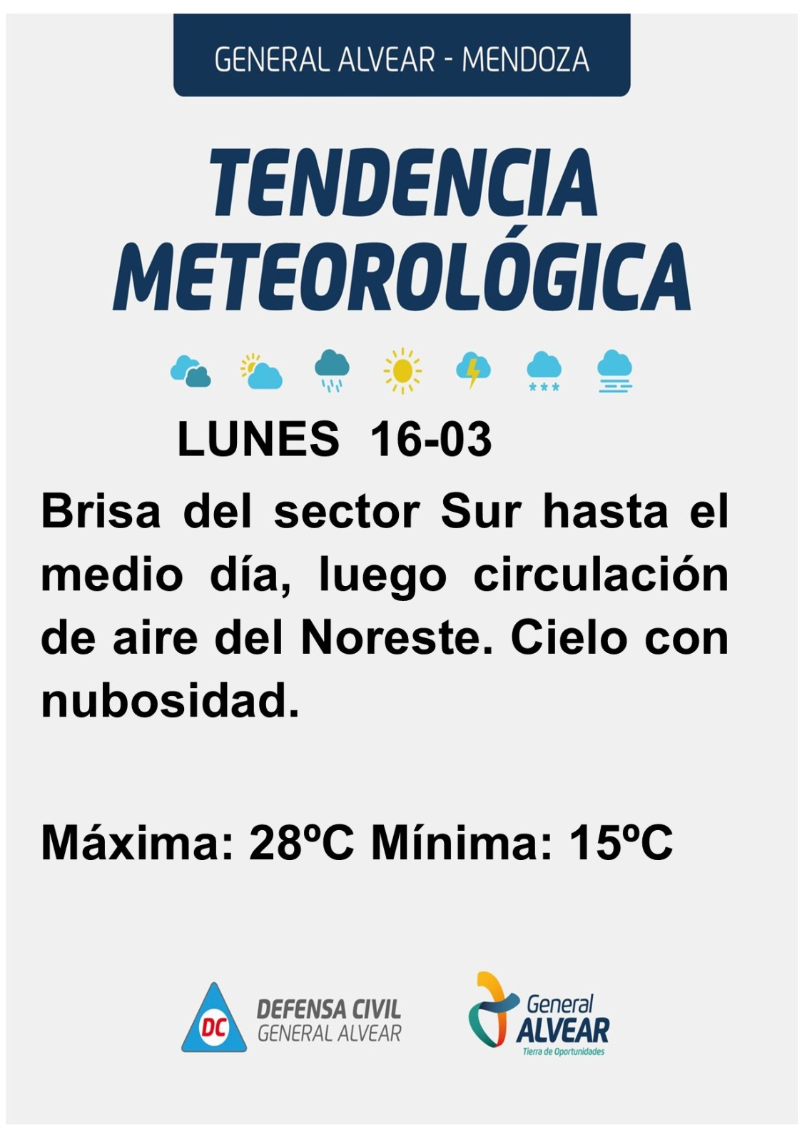 General Alvear y el sur mendocino transitan un lunes 16 de marzo con condiciones variables. Tras un domingo caluroso, la atmósfera comienza a mostrar signos de inestabilidad debido a la interacción de brisas del sur y la influencia de vientos de altura que afectarán principalmente a la zona oeste de la región.